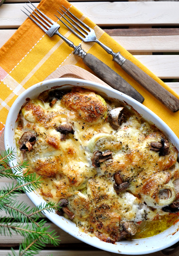 Grease baking dish with some olive oil, and start layering. Half of the carrots first, than 4 pork chops, half of onions, half of gouda cheese (skip for #nodairy), spread it with generous amount of mayo and sprinkle with oregano. Then start again. If you use cheese for this recipe, put some on top. It will melt deliciously with a layer of mayo. Finish with mushrooms cut in halfs.