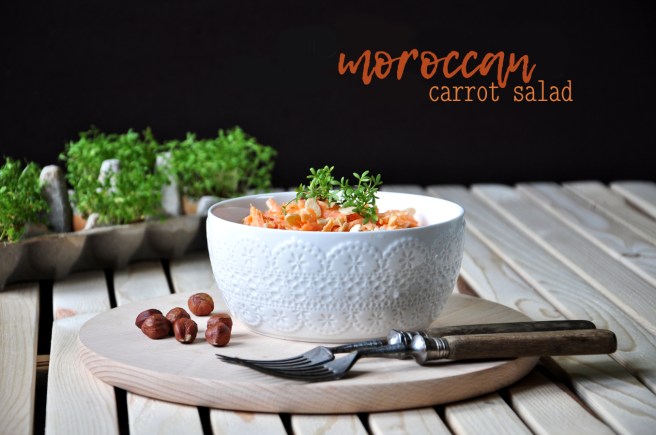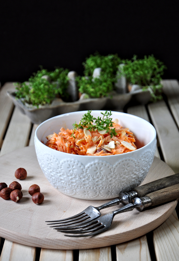 Cut hazelnuts in halfs and stir in to carrots. Roast almond flakes on a dry pan. Don’t skip this step, because roasted almonds gives a fabulous flavor to the salad. Cool them down a little, and add to your salad. You can decorate it with some sprouts – I’ve put some cress on top, it also adds some spicy flavor.