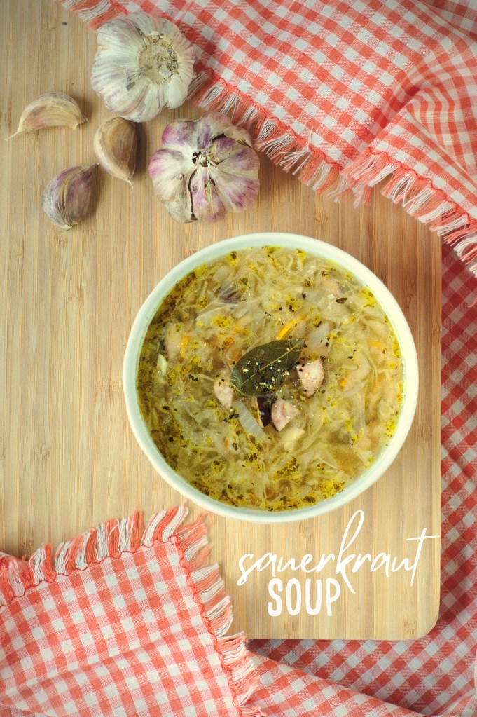 Sauerkraut soup is a great warmer. Especially if you add a good pinch of pepper. Addition of garlic makes it even more healthy. You can serve it any time of the day. If you feel cold in the morning or you struggle with cold hands and cold feet, this soup will warm you up for sure. Actually any warm soup eaten in the morning will help if you feel cold. According to Chinese theory of five flavours, respectively prepared soups with certain condiments, cooked for few hours have a giant energy power and strong healing properties. It also makes your jang higher – it means your heat and energy. So feel free to use slow cooker to make this soup.