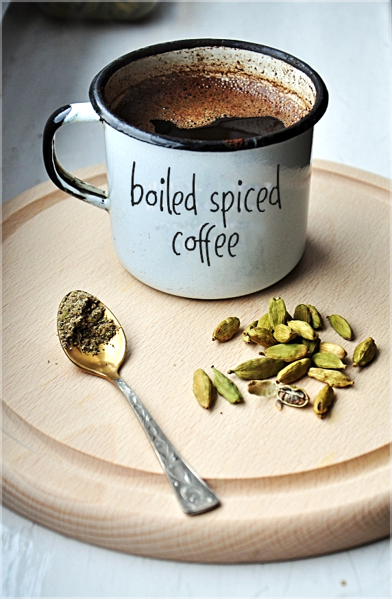Put the coffee and all the spices to a small pot, pour the water in and heat to boil. Then lower the heat and simmer for 5 minutes. Leave it for few seconds, so the coffee grounds will fall on the bottom. Pour to the cup and enjoy 🙂