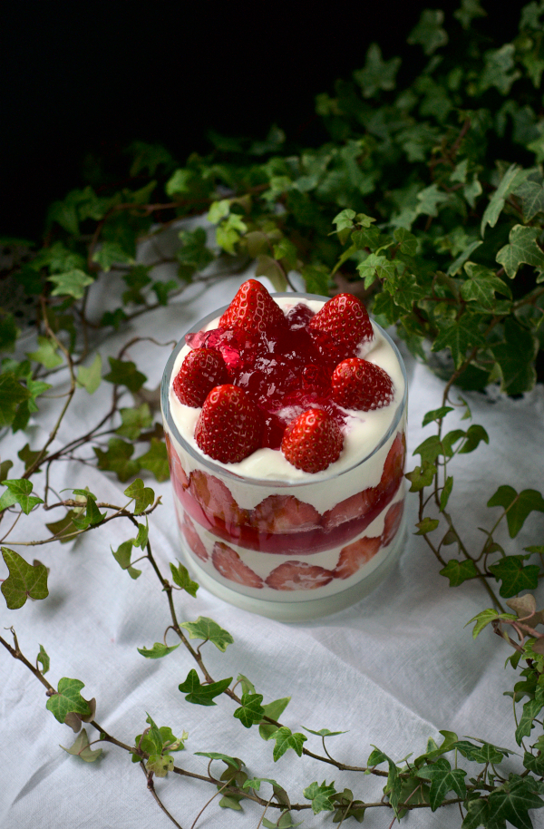 I’ve thinly sliced couple of strawberries and attached them to the sides of glass dish, added some more chopped strawberries on the bottom and a layer of cream. Then very gently started adding jelly layer. I’ve used a spoon to place the jelly, because whipped cream and mascarpone mix is quite fluffy and delicate, so if you pour it straight you’ll make a hole in it. You can see that my jelly layer is “contaminated” with cream.