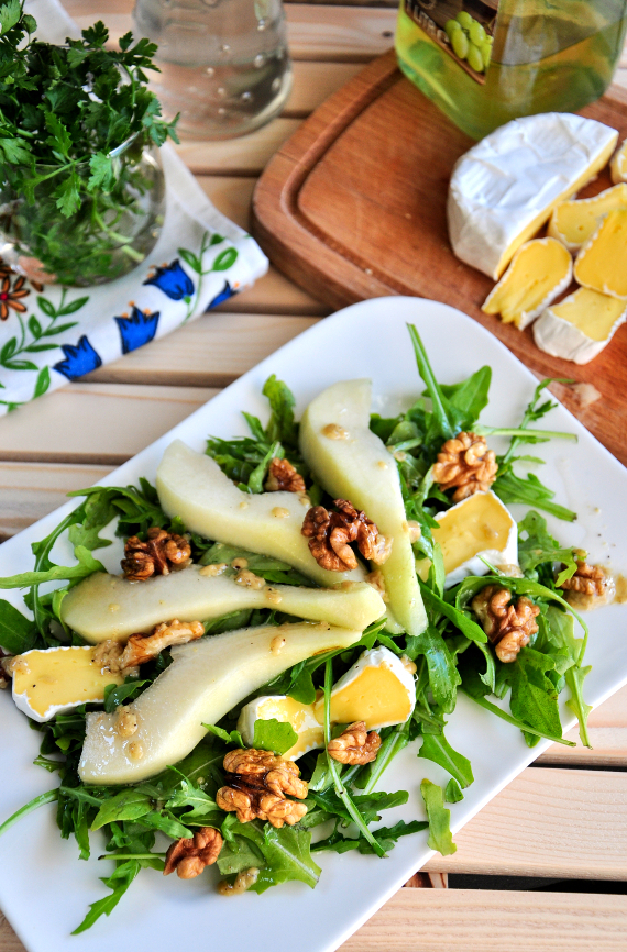 I would like to warn you right away, that not everyone will like this combination, but if you like to experiment – go ahead! I really enjoy this fusion of sweet and juicy pear, camembert and of course walnuts! Nuts and camembert are magical combination, and works perfectly together. Addition of some sweetness of fruit and spiciness of rocket, makes it not only looking quite fancy and elegant, but also gives a nice taste twist. All that makes it a great summer salad for more elegant party or romantic dinner for two. It’s so easy to make, you only need a couple minutes to prepare the ingredients. Then just place them nicely on the plates and there you go.