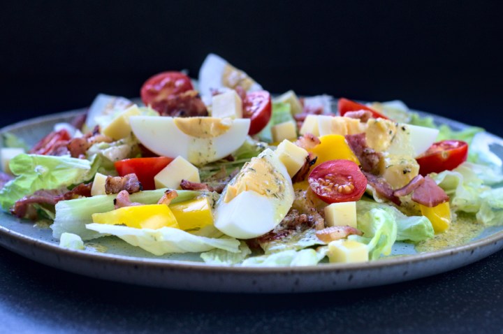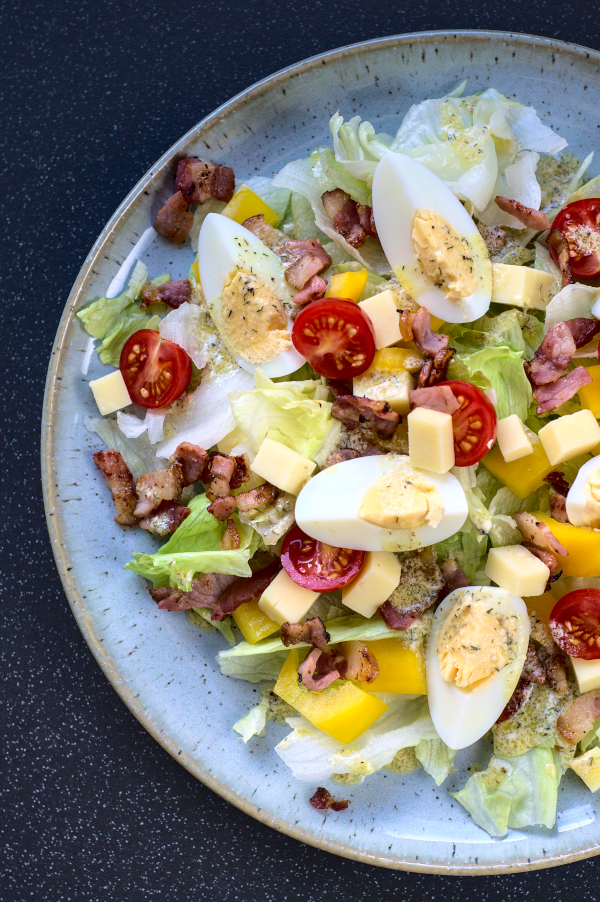We live in a rush and the rush makes every activity we perform regularly automated. In a hurry, we do not pay attention to who we pass by on a sidewalk, to plants and animals around us. Even our conversations are sketchy and insignificant. We pay attention to how we look, fortunately we’ve started to pay more attention to what we eat, but still we don’t focus on how we eat. Focused on daily problems, things to do, errands to run, sometimes we forget to taste what we eat. Eating fast, eating meals on autopilot like it’s just another necessary activity to be done on a given day, often additionally perceived as a waste of valuable time. When we eat, it takes 20 minutes for the signal from the stomach to tell our brain that we are full. If we eat in a hurry, such a signal may appear delayed in relation to the food consumed. Salads are great way to practice mindful eating. You have to put each ingredient on the fork, you can try each ingredient separately or in pairs. You have to chew for a while, so you can focus on the texture. Crispy iceberg salad, firm and juicy tomatoes, salty bacon, sharp and mature cheddar, slightly bland egg white dipped in spicy dressing. So many taste sensations in one salad. I encourage you to spend some special time with yourself when preparing and eating this salad. Even if you think it sound kind of ridiculous giving so much attention to a simple thing like this one.