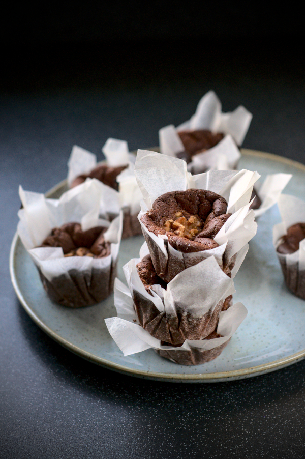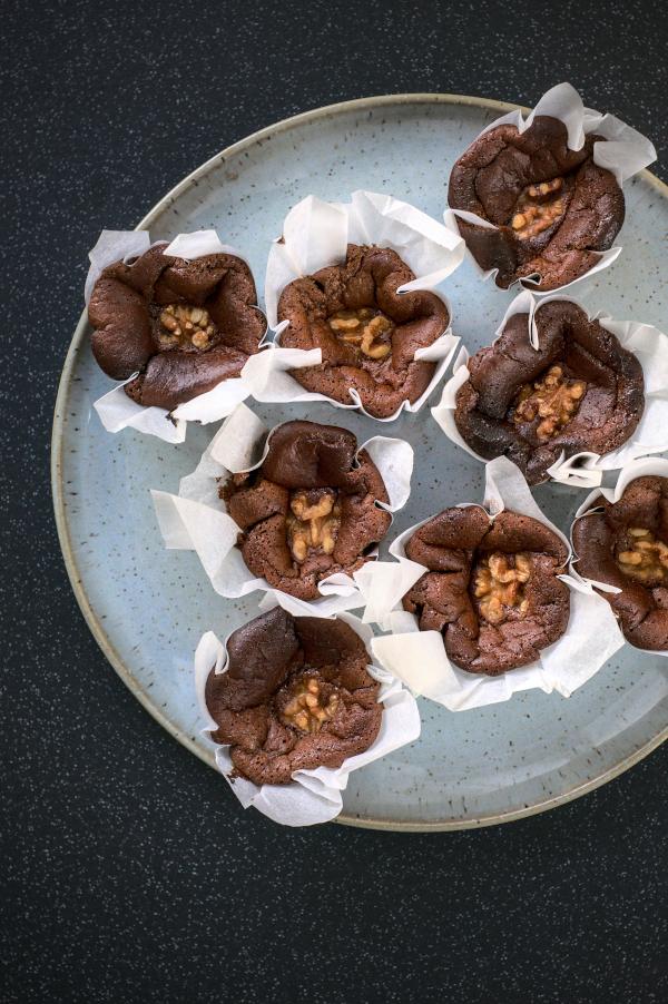 Pour the batter to each form and place a piece of walnut on top. I’ve managed to fill up full tray of muffins and had leftovers of batter for another few. If you want to make just one round use 2 eggs instead of 3.