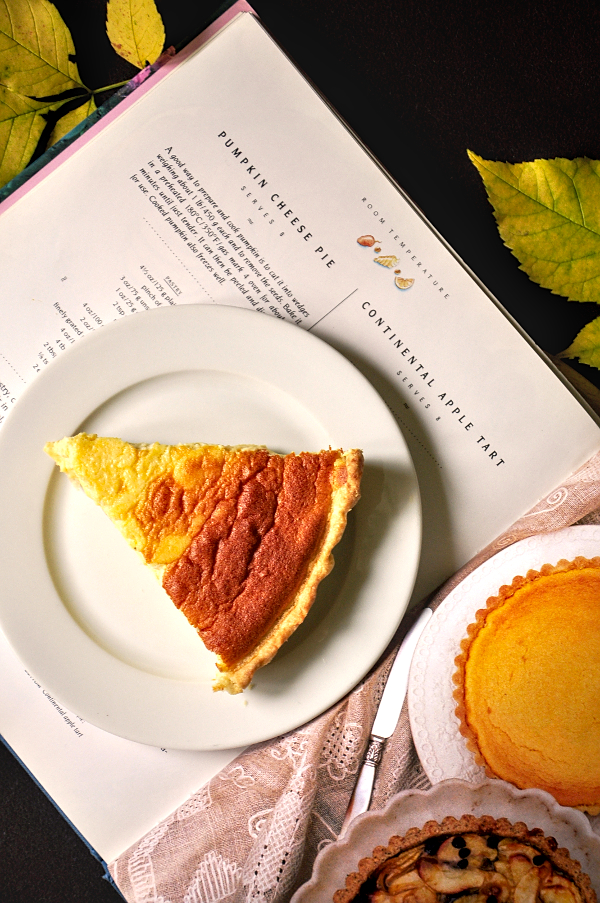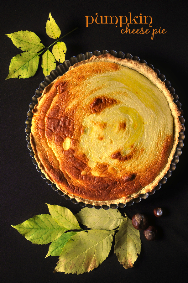 Take the pastry out of the oven and set the temperature to 170ºC. Pour the egg white into a cheese-pumpkin mix and combine gently but thoroughly. Pour it over the pastry and put it in the oven. I baked on the middle shelf of the oven, but you can put the dish on the slightly lower shelf – the top of the pie gets browned quickly and the bottom of pastry was pale, so it’s better to put the pie slightly lower to make the pastry golden on the bottom. After baking, leave the cake for about 20 minutes in the oven slightly opened, then set it aside to cool down.