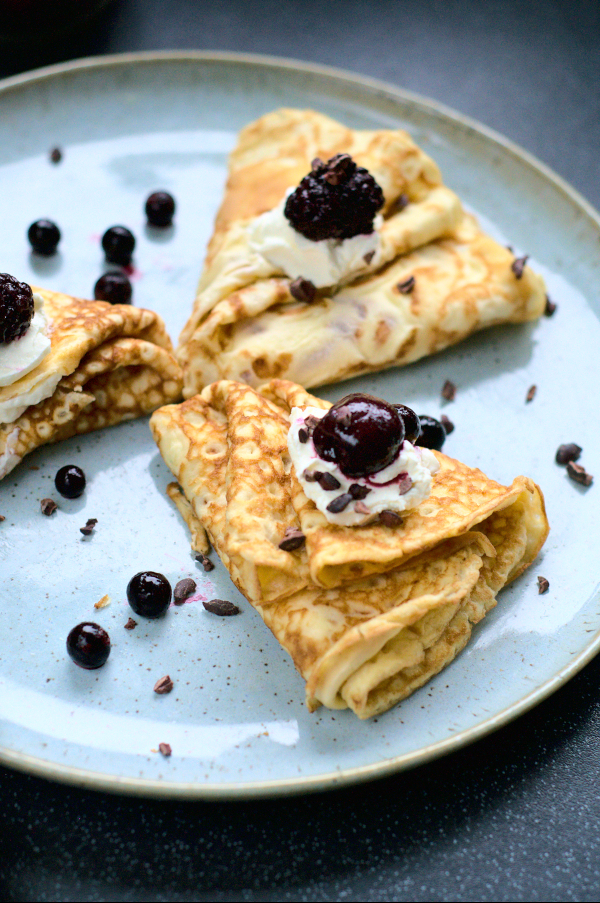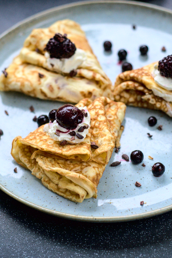 When you have the amount of crepes you need, take some cream cheese and spread it evenly on one side of the crepe. Then fold it in half, and then in half. You can fold it one more time as I did, if you want. Do the same with the rest of crepes. Arrange them on a plate, put some more of cream cheese on top and handful of black forest fruits. Sprinkle with cacao nibs or some cacao powder and serve.