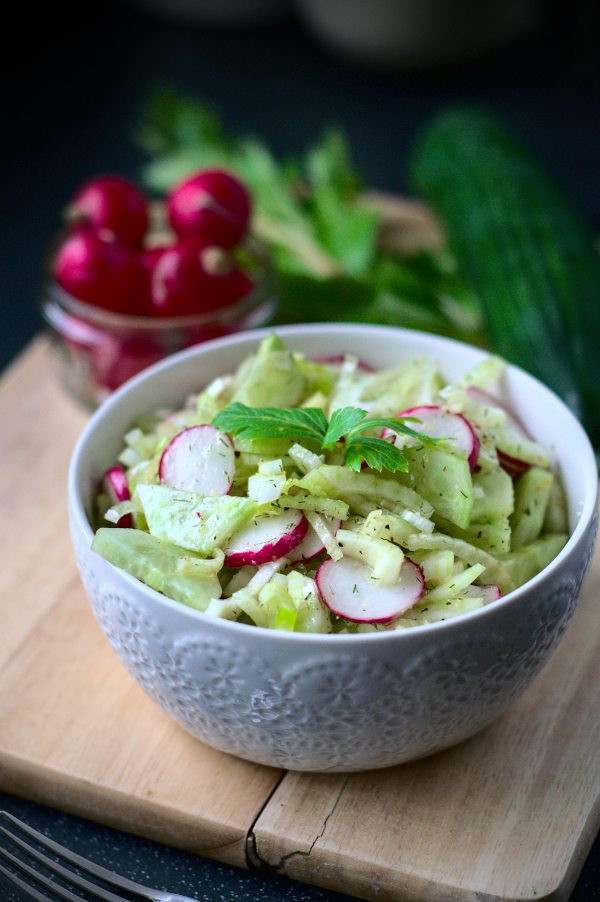 Pleasantly crisp, light and aromatic, because of fennel and it’s characteristic smell and taste (if you ever tried fennel tea, you’ll know what I mean). As a color accent and some spiciness I added a lot of radish. Cucumber goes great with them both. Very simple dressing: olive oil, salt and good pinch of lemon pepper for extra freshness – 10 minutes of work and delicious salad is ready. It will be great with fish or chicken or by itself as a crunchy snack or light supper.