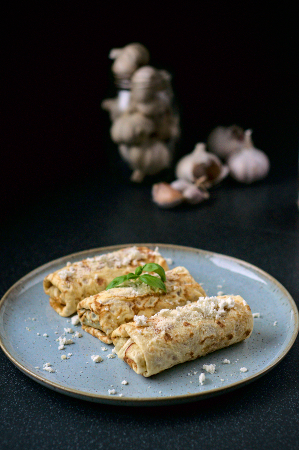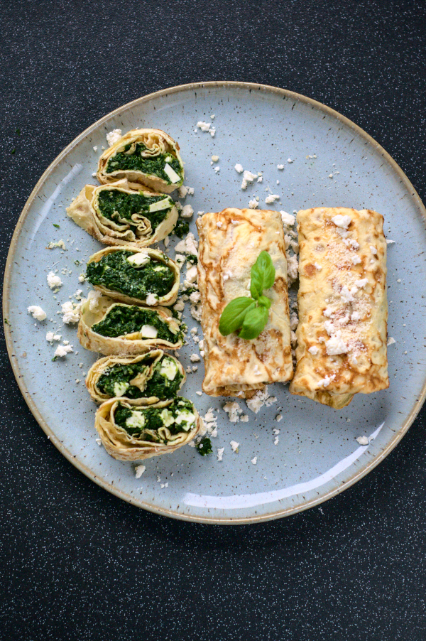 In the meantime, crumble or chop feta. Add to spinach and combine. Place about 2 tablespoons of filling on each crepe and roll in a burrito, sprinkle with grated Parmesan and additional feta and serve.
