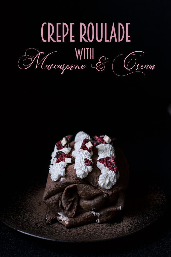 I watched this video about a million times and I can’t figure out how the crepes are rolled, so there is no overlap, like on the side of my roulade. Possibly they roll it much smaller so the last crepe wasn’t overlapping, but it’s hidden inside. Look at the darker side of my photos and you’ll see the ending of the last crepe. Also I placed quite a thick layer of mascarpone, so maybe that’s why my roulade was thicker and that last crepe couldn’t hide under. Keep it in mind while rolling.
