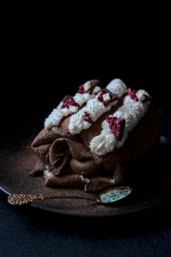 Prepare fresh batter for each crepe, mixing one egg, 1 teaspoon of cacao powder and 2-3 teaspoons of double cream.