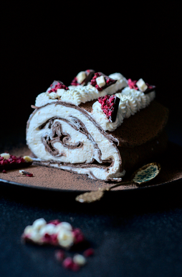 Place on a plate, dust with some more cacao powder and serve. I’ve been left with some leftovers of mascarpone filling, so I made small decoration on the top of my roulade using piping bag and a special tip (that’s my second time I used it, so bare with me). Placed couple pieces of dark chocolate and voila!