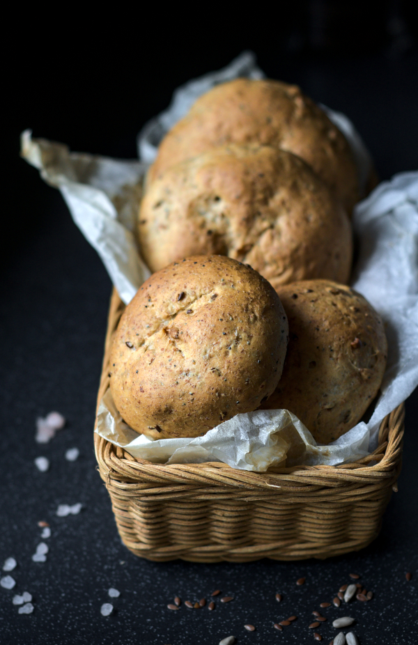These spelt buns are so delicious, that even I couldn’t resist and made myself couple sandwiches. When you start making your own bread and buns at home, you won’t be so keen to come back to store-bought bread. Especially these wholemeal spelt buns with sunflower, poppy and linseeds. You could not resist to this gold crispy crust.