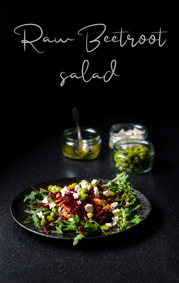 Furthermore when turn of winter and spring I cant wait to eat more fresh and raw foods. I miss freshly made salads, fruits and smoothies. But it’s still a bit cold and my body needs something warming and comforting. (And everybody knows that sugar cookies and cheese crackers brings comfort – for the moment when you eat them.) That’s how the idea for this raw beetroot salad came to me. And you know – I had a giant bowl of it and I felt nourished and fresh.