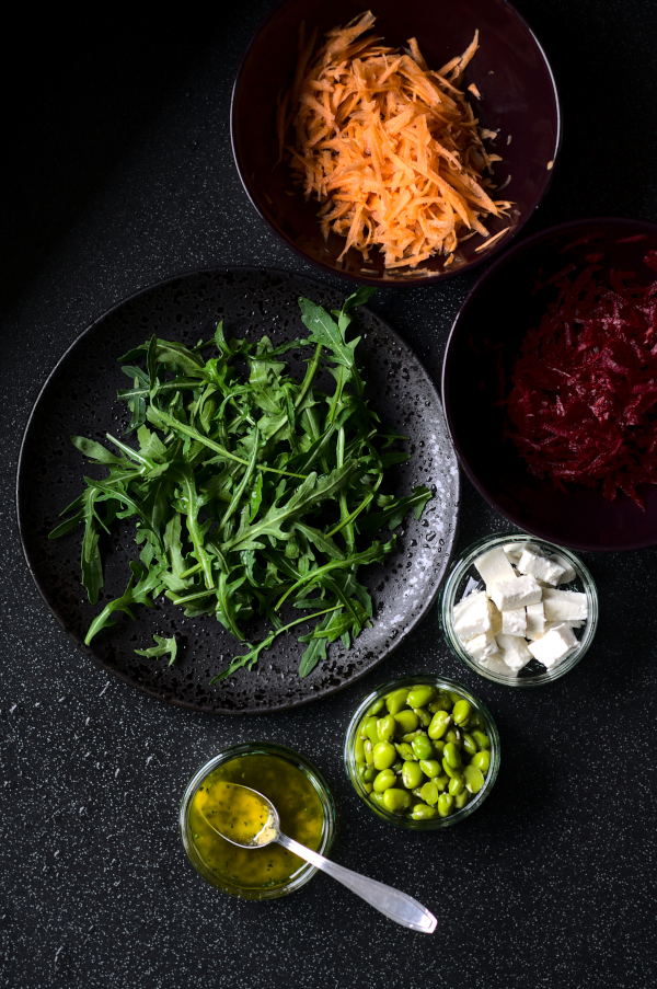 Peel and thoroughly wash beetroot and carrot. Grate them both on large hoops. Thoroughly rinse a handful of rocket, if you want, you can peel broad beans like I did. If you don’t want to bother yourself with it, just leave it with skins. I did it just because I like the fresh green of them.