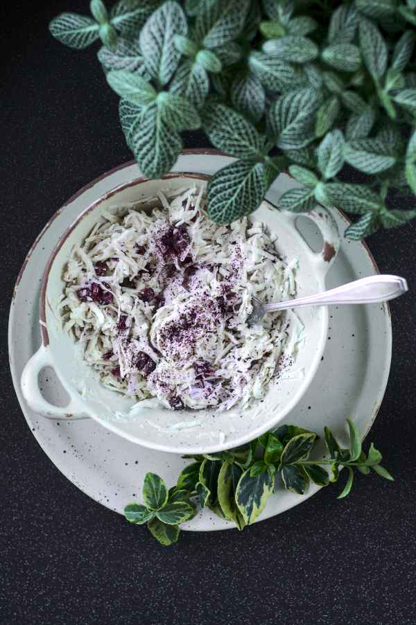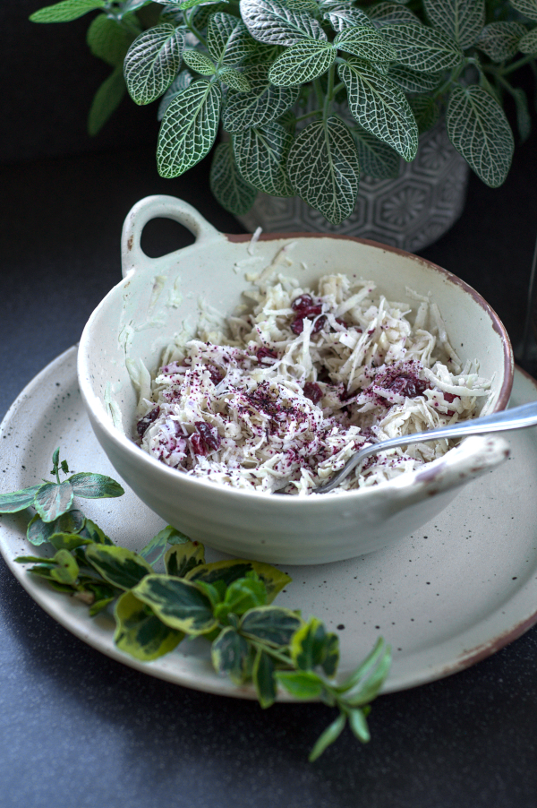 I had some leftovers of cranberries and some celery root, and because I like combining fruits and veggies in salads I decided to make this simple side salad. It’s very easy to make mix of celeriac, little bit of apple, some cranberries (but raisins will work too, although they will add more sweetness) and spices. And this purple powder you see on the photos is pinch of pomegranate tea I found in my cupboard. I thought that it’s purple colour will look great with cranberries and it also added some fresh, fruity flavour to the salad. I think that hibiscus tea would also work great as an exotic addition.