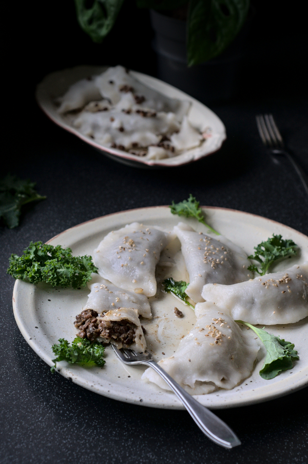And now the taste. The dough has quite specific texture and taste, it’s not bad at all, but I prefer regular wheat flour dumplings. But if you absolutely cannot eat gluten, definitely you should try this recipe. It may need some practice to perfect it, but it’s definitely worth trying. The filling is really tasty, good enough that my partner wants me to make more green lentil dumplings. Next time also instead of adding sesame oil I will fry some onions and use it as a garnish, because sesame seeds oil was a little bit bitter in this case.