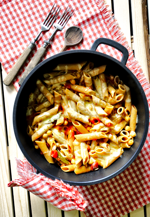 Add chickpeas and a pinch of chilli to the stewed tomatoes. Stir and finally add the cooked pasta. Mix thoroughly so that all the pasta is covered with sauce. Now either put it in a greased baking dish, sprinkle generously with cheese and bake in the oven (180 ° C, until the cheese melts), or, in my case, leave it on the plate for another 10 minutes, until the cheese melts. Which is also much faster.