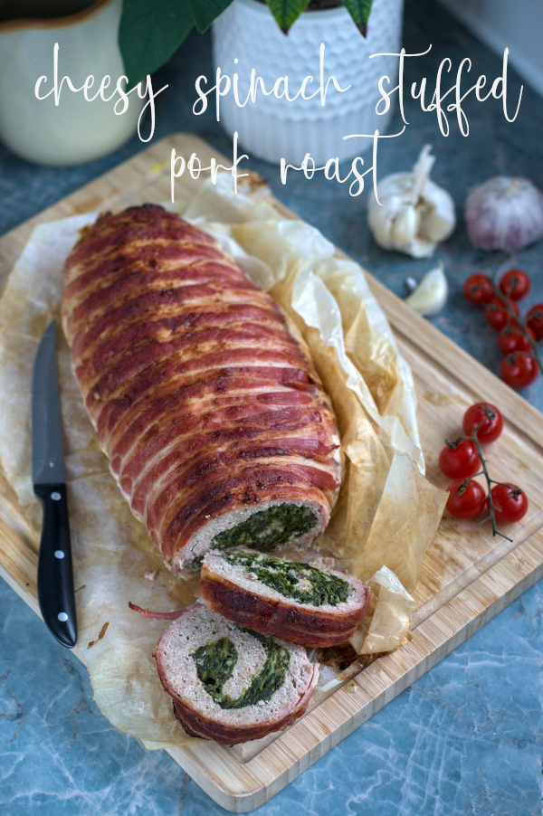 Add cream cheese and mozzarella to spinach and combine. spread it evenly on the meat, then roll it helping yourself with using baking paper. Leave it on the one end of paper and on the other end place bacon rashers, they should slightly overlap each other to wrap nicely your pork roast. Now gently roll the meat back, so it wraps in bacon slices. It seems complicated when I explain it, but it’s actually really easy.