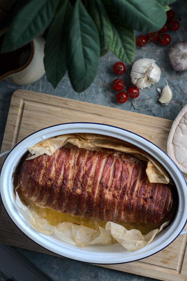 When meat is nicely wrapped, place it on the same piece of baking paper and put to a roasting pan. Heat the oven to 190° C and bake for about 60 minutes – until bacon becomes golden brown and crispy.