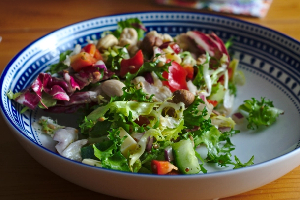 You can actually prepare this a salad from your favourite vegetables, because all the goodness is hidden in the sauce. The base is extra-virgin olive oil, dark green and bitter in taste, but rich in omega 6 and 9 as well as vitamins E and K. Soften its taste with a teaspoon of heather honey and a little lukewarm water. Add little pink Himalayan salt, which, unlike regular table salt, is said to be rich in minerals. Himalayan salt has a slightly different salty taste than regular salt and I think that it is perfect for salads. And finally linseeds which are good for your skin, hair and digestion and nuts which they are tasty and healthy any time, anywhere. The finished sauce is delicious and I was basically tempted to eat it alone without the salad.