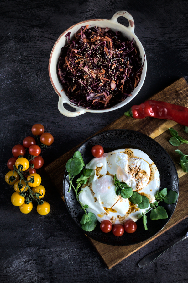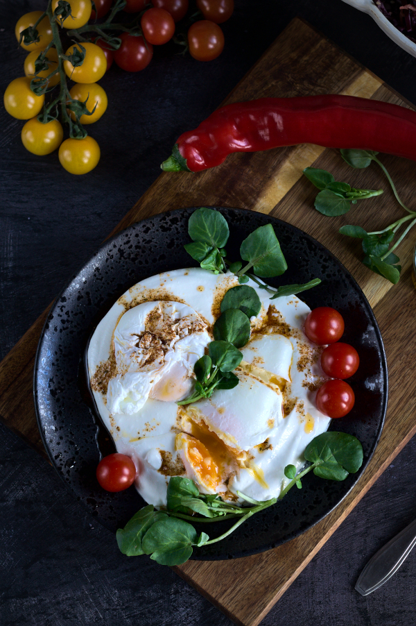 In this recipe poached eggs are served on warmed up Greek yoghurt with butter, olive oil and some spices. I wouldn’t be myself if I didn’t add some greens and tomatoes, but feel free to add whatever you like.