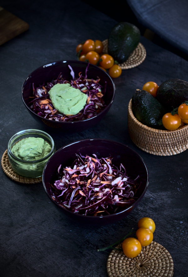 I love the crunchiness of this slaw mixed with creamy avocado dressing. It’s so good that my partner ate all of it even though he’s not really a fan of avocado. Addition of wasabi gives lots of tangy flavour to gentle and nutty avocado. Mayo is always good, there’s no point for discussion 😉 But if somehow you don’t like mayonnaise, I think if you add Greek yogurt would work as well.