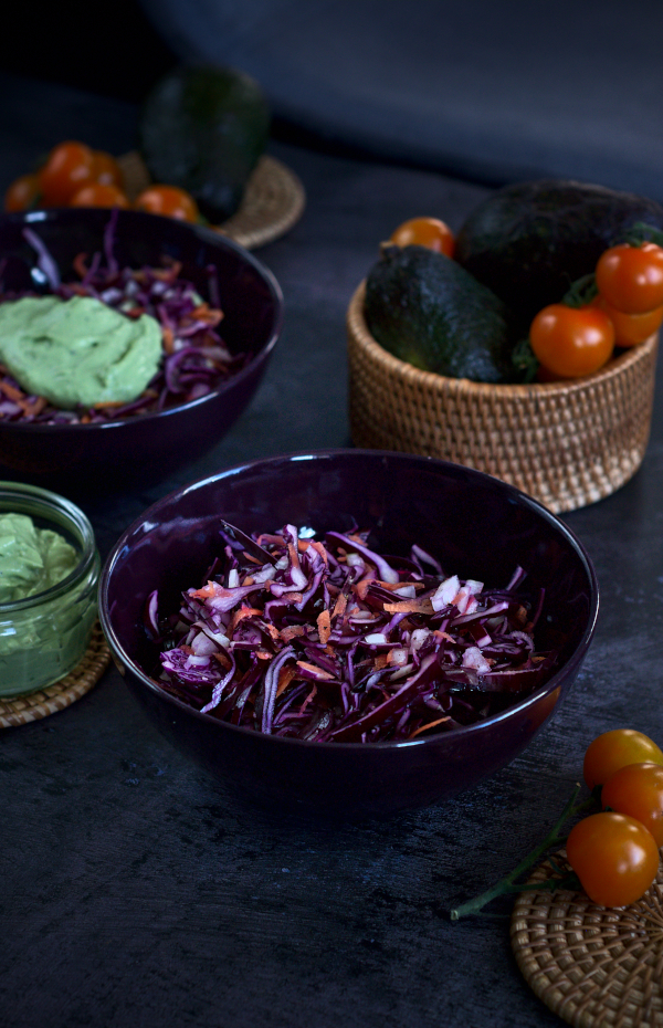 Combine your dressing with red slaw just before serving. Avocado oxidise strongly, so with time your dip becomes rather greyish colour (addition of lemon juice helps but it will not remain nicely green for long time). So always keep it in air tight container and mix with slaw before serving.