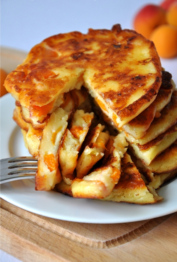 That was the days when I was exploring recipe world, there was no one day with the same meal. It’s a really great recipe – 80’s were masters of making something out of nothing. The pancakes came out plump, delicate and I think that even without the addition of apricots (because there are no apricots in the original recipe) they would be delicious. I love apricots. I like all nutty flavours of fruit, and apricot has such a slightly nutty flavour for me. In addition, they have a beautiful colour – probably even peaches are not so pretty.