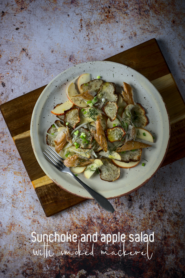 So I started looking for a recipe inspiration as I always do with foods that I never prepared before. And I found a perfect one, as I had (almost) all ingredients. So that’s my version of this sunchoke and apple salad, prepared with the leftovers I already had in my kitchen. I had one organic Gala or Pink Lady apple, leftovers of smoked mackerel insteadt of trout, ordinary brown onion instead of shallots, plus some spring onions from the same veggie box instead of fresh basil. And I have to say that I was pleasantly surprised with the final taste. It looked a bit like randomly chosed ingredients, but somehow worked together very well.