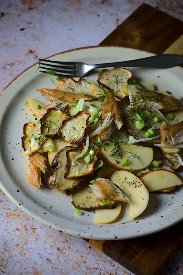 Tangy and crispy apple, mellow and gentle taste of baked sunchoke, smoked fatty fish broken a bit by the taste of apple cider vinegar and onion. And lots of black pepper that I really enjoyed in this salad, all of that made a great salad I have ate with pleasure.