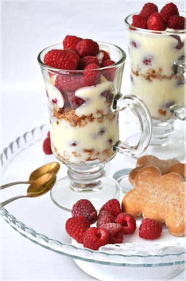 It’s a bit cheated trifle, because it has no sponge cake, alcohol or jelly in it. But it’s the quickest trifle you can make. It’s a mix of Summer and Winter flavours – I love the spiciness of ginger, cinnamon, cloves and nutmeg combined with fresh and juicy raspberries. Creamy vanilla pudding let the flavours melts together in a sweet and spicy harmony.