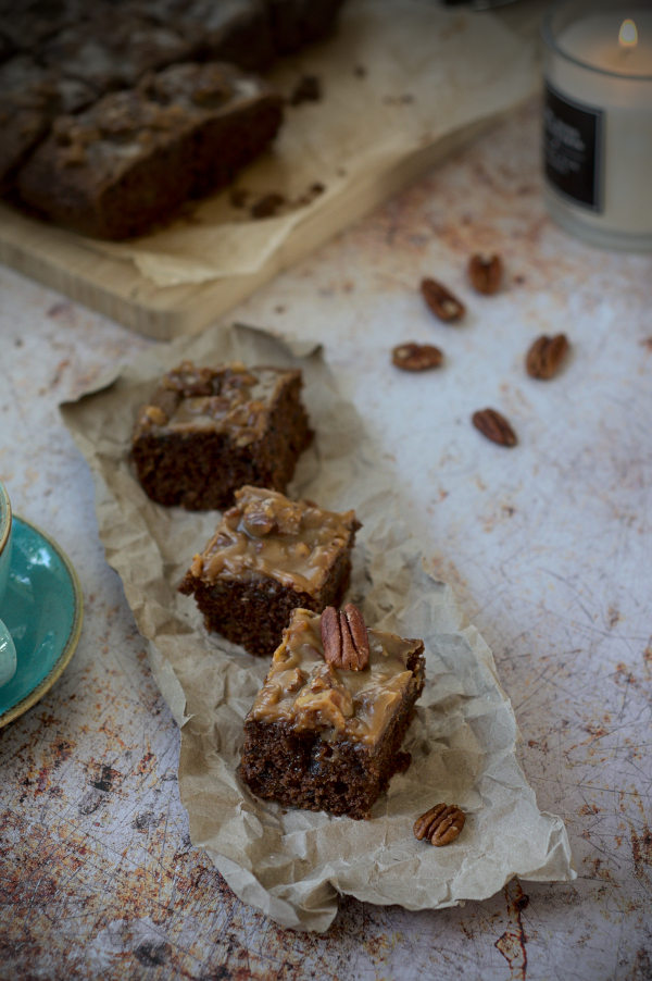 Remove cake from the oven. Pour over the pecan caramel and spread it evenly over the cake. Let the cake cool down completely. Cut in squares and serve.